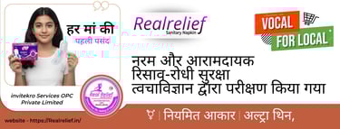 इनवाइट करो सर्विसेज OPC प्राइवेट लिमिटेड एक भरोसेमंद भारतीय कंपनी है, जो महिलाओं की स्वच्छता और स्वास्थ्य को ध्यान में रखते हुए रियल रिलीफ ब्रांड के अंतर्गत उच्च गुणवत्ता वाले सेनेटरी पैड का निर्माण करती है। हमारी कंपनी जमुई, बिहार में स्थित है और हम स्थानीय स्तर से लेकर राष्ट्रीय स्तर तक महिलाओं को सुरक्षित, आरामदायक और किफायती सैनिटरी समाधान उपलब्ध कराने के लिए प्रतिबद्ध हैं।